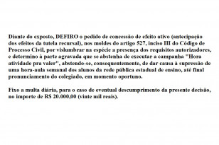 11:00 Justiça manda acabar com a “Hora-Atividade pra Valer” A APP-Sindicato terá de pagar multa diária de R$ 20 mil à Justiça do Paraná caso continue a estimular professores do estado a liberarem alunos das aulas.