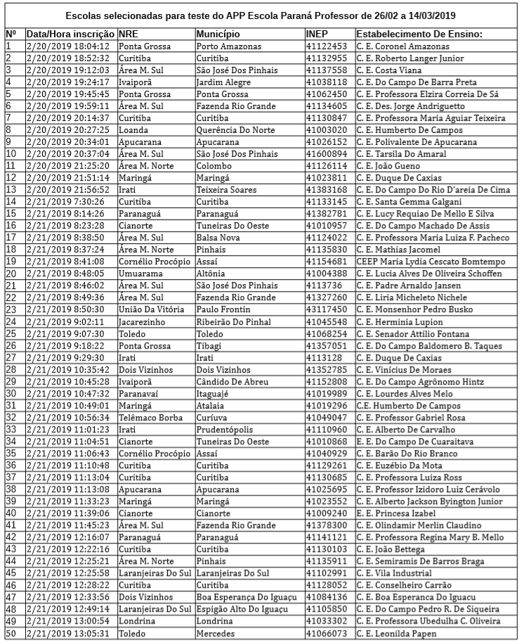 Escolas Selecionadas - Teste APP Escola Paraná Professor