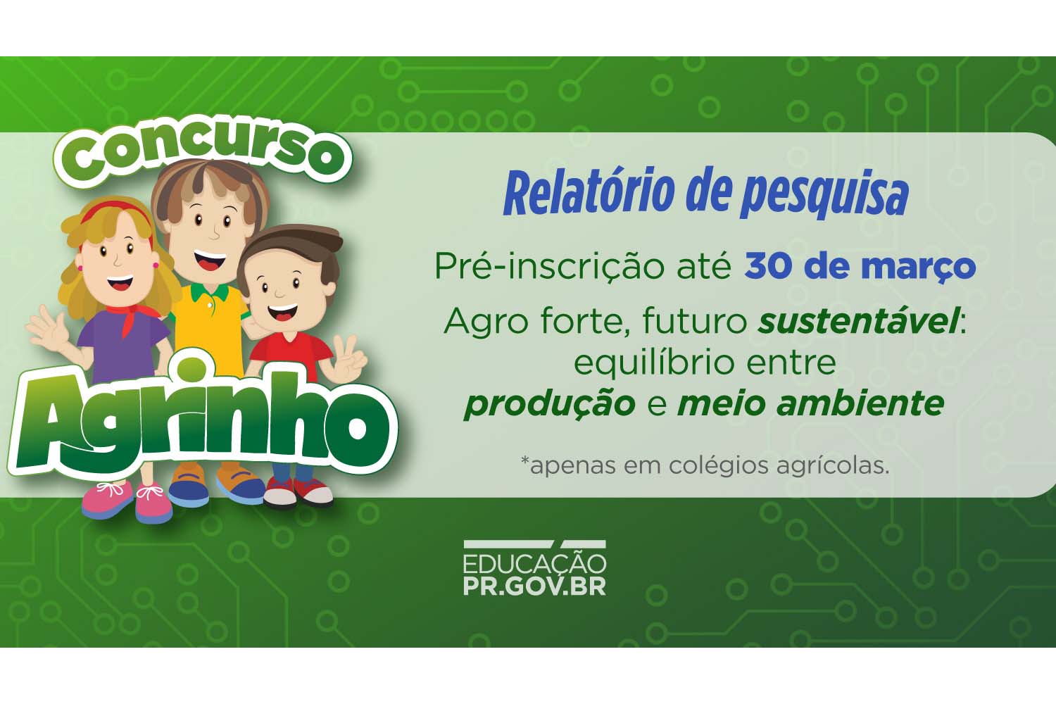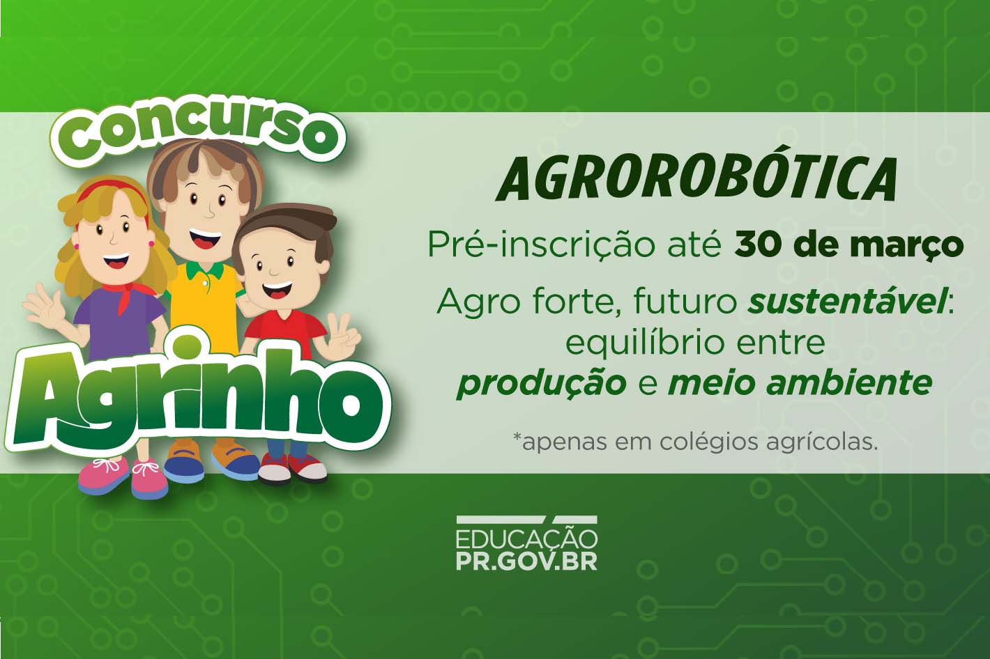 Estudantes dos colégios agrícolas da rede estadual de educação têm até o final desta segunda-feira (30) para efetuar pré-inscrições nas categorias Agroróbotica e Relatório de Pesquisa do concurso Agrinho 2026. O período de inscrições teve início no último dia 16. Ambas categorias são exclusivas para alunos dos cursos técnicos em Agricultura e Agropecuária nos colégios agrícolas estaduais.