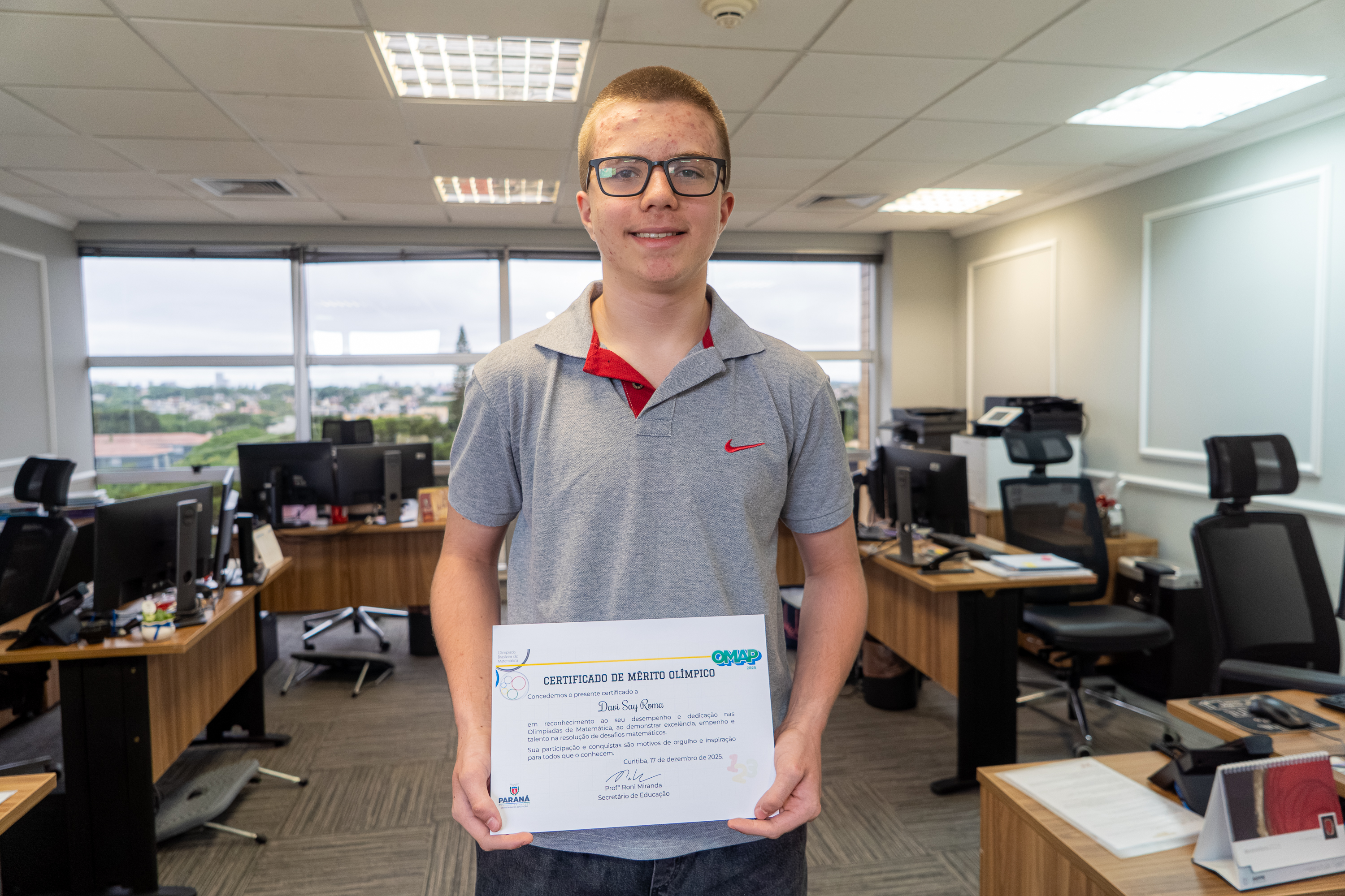 A educação paranaense tem mais um motivo para comemorar em 2025: o estudante Davi Say Roma, de 14 anos, conquistou a primeira medalha da rede pública do Estado na Olimpíada Brasileira de Matemática (OBM), que aconteceu nos dias 9 e 10 de outubro.