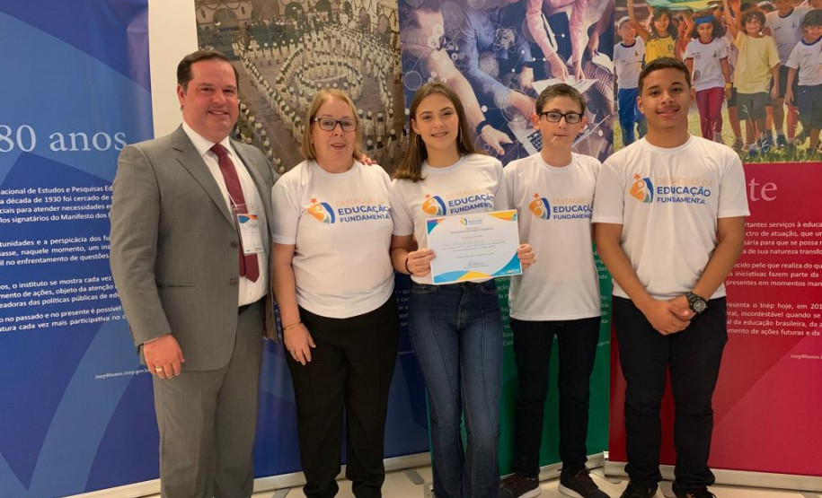 Acompanhada dos alunos Maria Vitória Fogaça, Guillermo Trillo e Wadson Souza Junior, representantes dos alunos, a diretora Iolanda Prudente recebeu das mãos do ministro da Educação, Abraham Weintraub, o prêmio na categoria de evolução das notas do 9º ano do Ensino Fundamental. O Ideb da escola no Ensino Fundamental é de 6,7, o que coloca o Ulysses Guimarães entre os destaques entre as escolas públicas da região Sul do País.