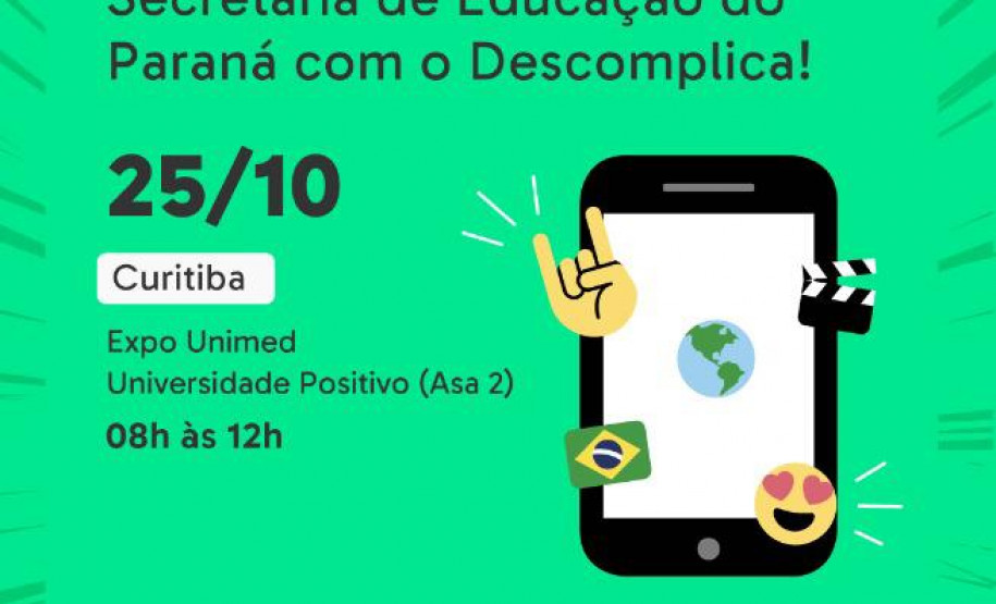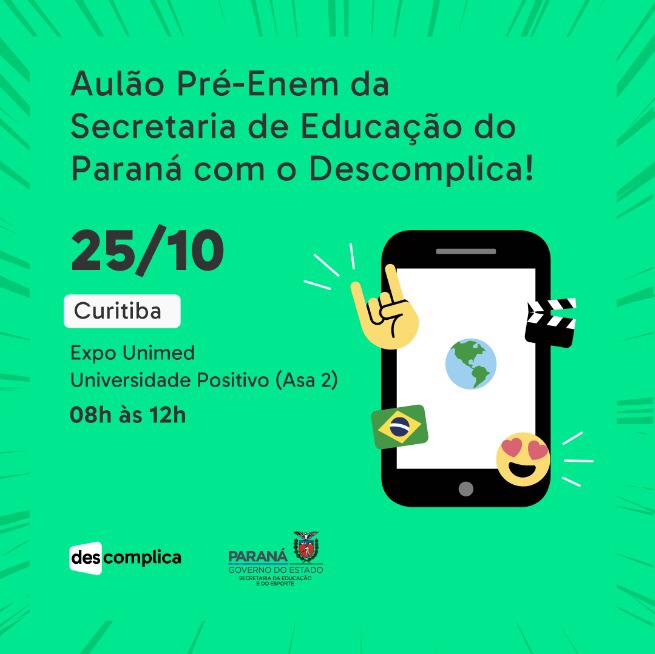 Nessa sexta-feira (25), a Secretaria de Estado da Educação e do Esporte (Seed), em conjunto a com a plataforma de ensino on-line Descomplica, promove, na capital paranaense e para alunos de escolas do Núcleo Regional de Educação de Curitiba, aulão preparatório para o Exame Nacional do Ensino Médio (Enem). As provas serão aplicadas em todo o Brasil nos dias 3 e 10 de novembro.