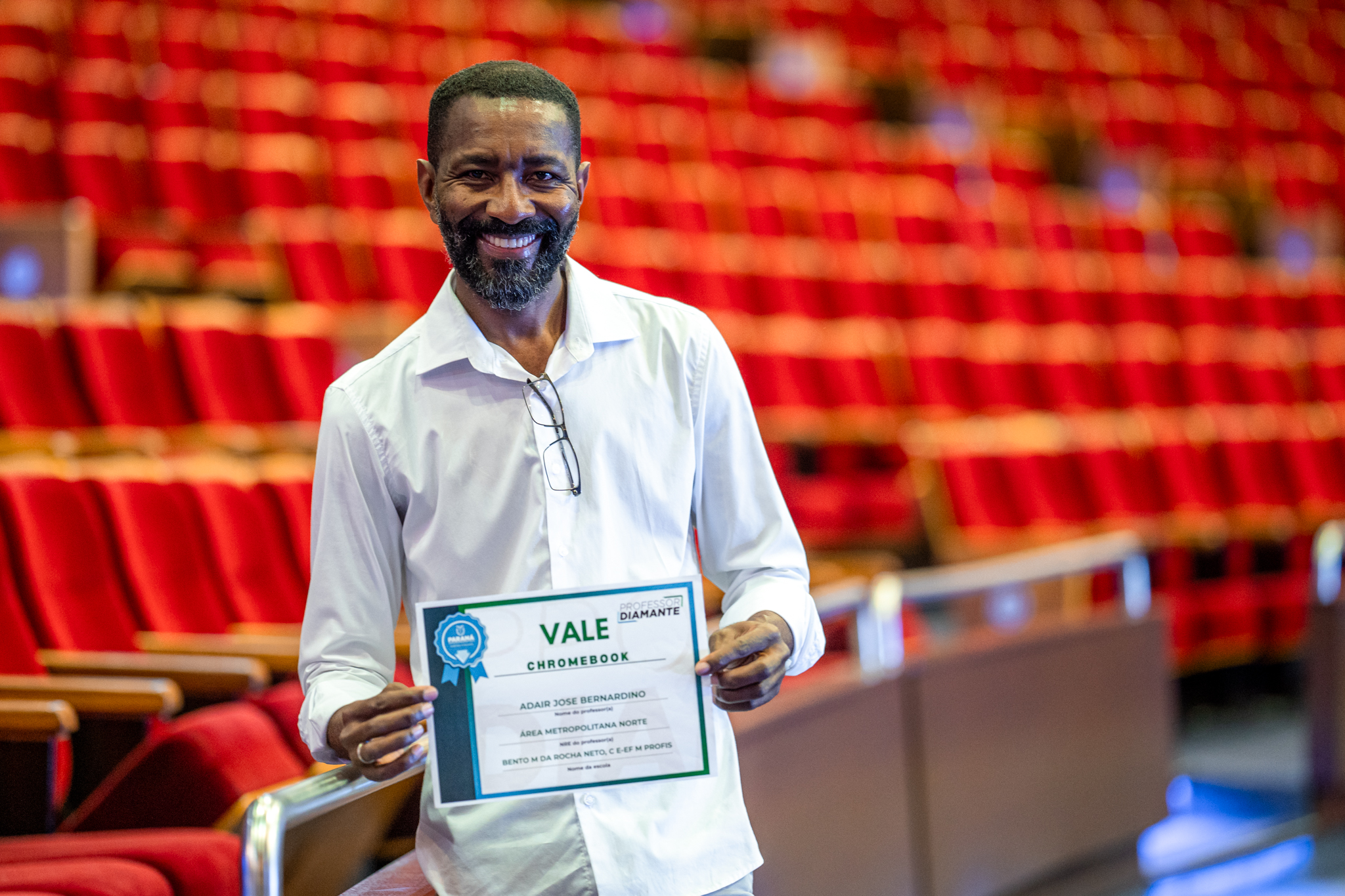 ADAIR, UMA HISTÓRIA – Entre os professores homenageados no evento esteve Adair José Bernardino, de 52 anos. Há 28 anos atuando como professor de História, Adair leciona no Colégio Estadual Bento Munhoz da Rocha Neto, em Colombo, na Região Metropolitana de Curitiba e é reconhecido pela comunidade escolar como exemplo de empatia, diálogo e inovação pedagógica.