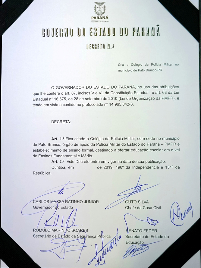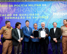 O Governo do Paraná deu início nesta quarta-feira (25) ao processo de implantação do Colégio da Polícia Militar de Pato Branco, que vai ocupar a estrutura do atual Colégio Estadual La Salle. Será a primeira unidade do Sudoeste do Estado. Em 2020 haverá uma transição pedagógica para a gestão da Polícia Militar, que começará oficialmente em 2021.