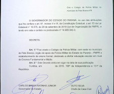 O decreto de instalação foi assinado durante cerimônia com a presença do vice-governador Darci Piana, do chefe da Casa Civil, Guto Silva, dos comandantes do Corpo de Bombeiros, coronel Samuel Prestes, do 5º. Comando Regional, coronel Dorian Nunes Cavalheiro, do 3º. BPM de Pato Branco, coronel Getúlio Ferreira de Lima, do diretor de Ensino da PM, coronel Ronaldo de Abreu, do prefeito Augustinho Zucchi e do deputado estadual Luiz Fernando Guerra.