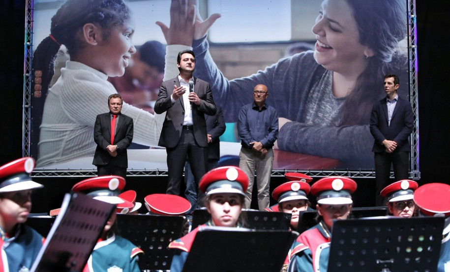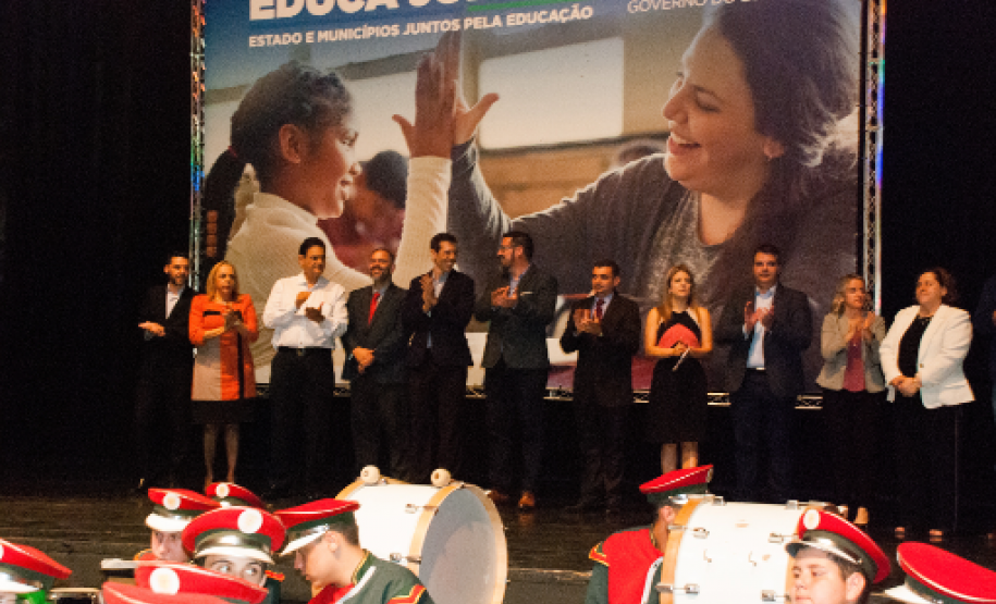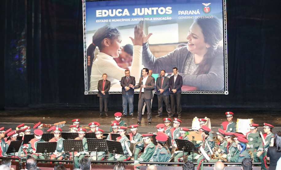 PRESENÇAS – Participaram da solenidade o diretor-presidente da Fundepar, José Maria Ferreira; o secretário de Estado da Saúde, Beto Preto; os deputados estaduais Luiz Claudio Romanelli, Mauro Moraes e Artagão Junior; prefeitos e secretários municipais da Educação de todo o Estado.