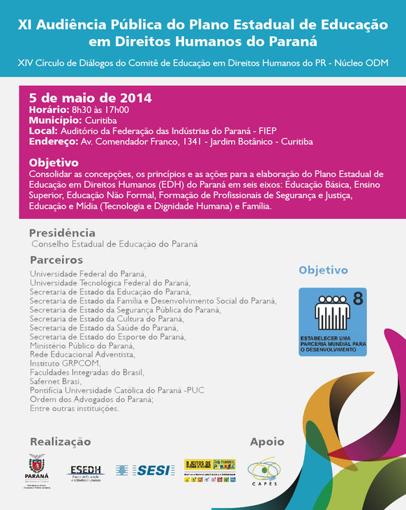 A abertura do evento contará também com as presenças de Edson Luiz Campagnolo, Presidente da Federação das Indústrias do Paraná (Fiep); Salete Moreira, coordenadora geral de Educação em Direitos Humanos da Secretaria de Direitos Humanos da Presidência, que proferirá a palestra de abertura da audiência; Fabio Meirelles, coordenador geral de Direitos Humanos da Secretaria de Educação Continuada, Alfabetização, Diversidade e Inclusão, do Ministério da Educação, que trabalhará o eixo Educação Básica e Educação em Direitos Humanos; Maria Tereza Uille Gomes, secretária de Estado da Justiça do Paraná, que abordará o eixo Formação de profissionais de Justiça, Segurança, entre outras autoridades e palestrantes.