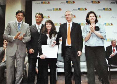 A professora esteve recentemente em Brasília, juntamente com outros vencedores, para receber sua premiação das mãos do Ministro da Educação Fernando Haddad. Ela recebeu R$ 5 mil, além de troféu e certificado expedido pelo Ministério da Educação. As escolas onde as experiências foram desenvolvidas e aplicadas também serão premiadas, todas escolherão equipamentos audiovisuais ou multimídia de até R$ 2 mil. “Eu lancei o desafio, tive o apoio incondicional da direção, dos professores e funcionários do colégio, por isso divido esse prêmio com todos eles”, comemora.