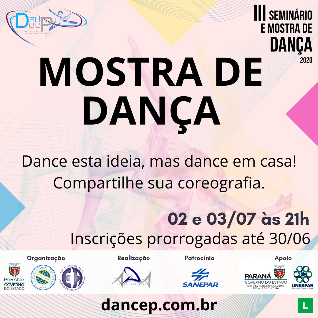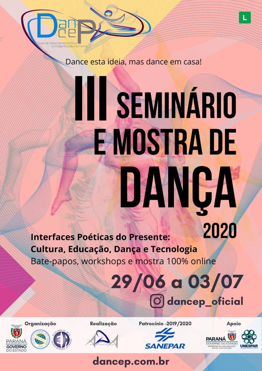 Artistas e profissionais da área de tecnologia participam na próxima segunda-feira, 29/6, do III Seminário e Mostra de Dança, com transmissão online. O evento promovido pelo O DANCEP - Grupo de Dança Contemporânea do Colégio Estadual do Paraná traz como tema principal As Interfaces Poéticas do Presente, voltada para se pensar de modo interligado questões da cultura, da educação, das artes e das tecnologias no atual cenário mundial de emergência sanitária e econômica, provocada pela pandemia da COVID – 19.